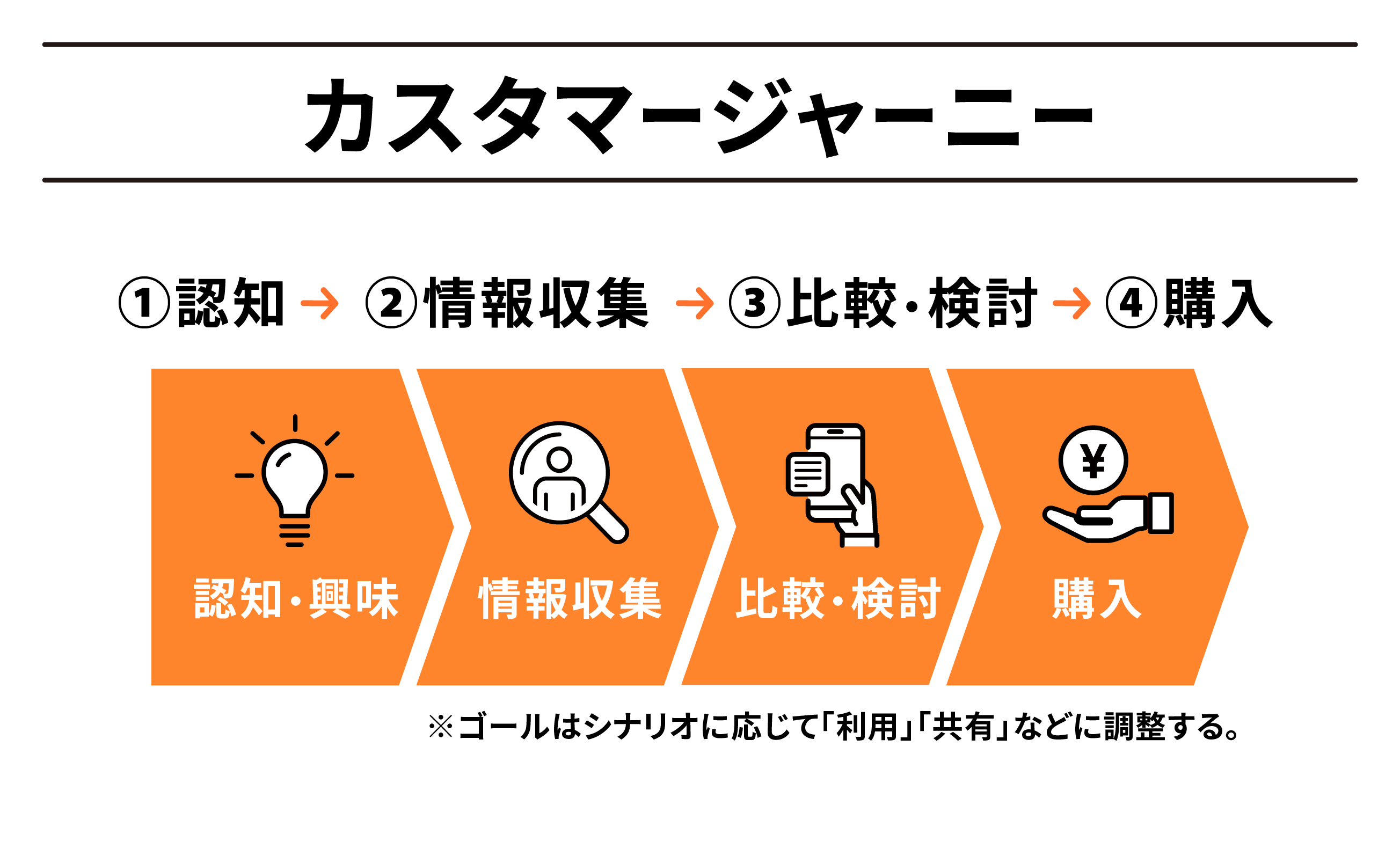 ユーザーが商品やサービスを認知してから、興味・関心を持ち、比較・検討を経て、購入という目的に至るまでの一連の行動を指す。