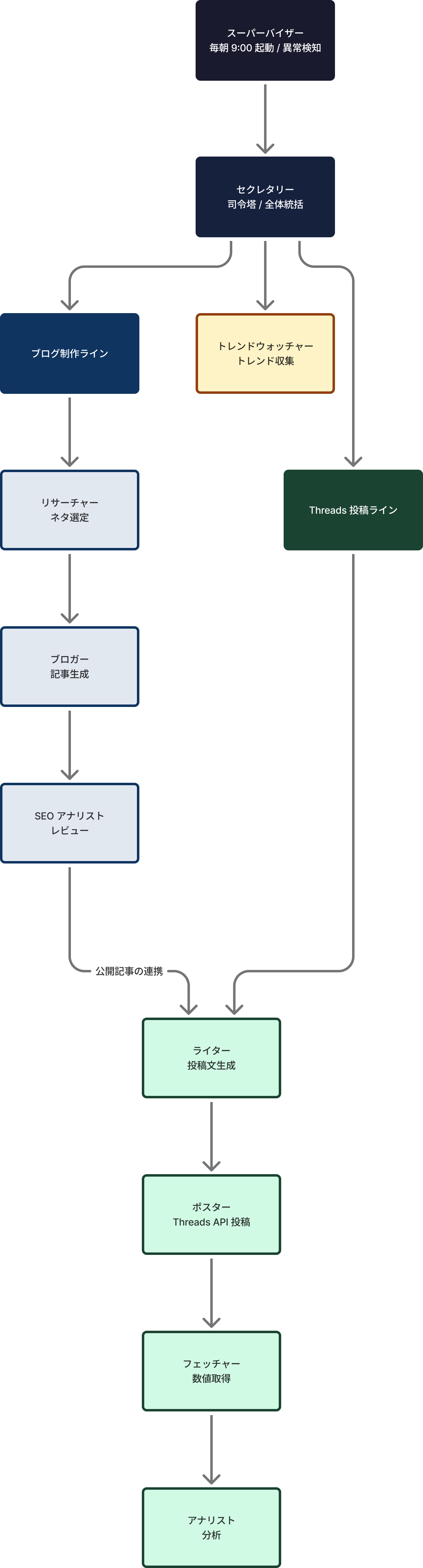 セクレタリーが全体を統括する司令塔。リサーチャーがネタを選ぶ。ブロガーが記事を書く。SEOアナリストがレビューする。ライターがThreadsの投稿文を作る。ポスターがThreads APIで実際に投稿。フェッチャーがいいねやリプライの数値を取得して、アナリストがそれを分析する。トレンドウォッチャーがGoogleアラートからトレンドを拾う。スーパーバイザーが毎朝9:00に全員を起動して、異常があれば検知する。
