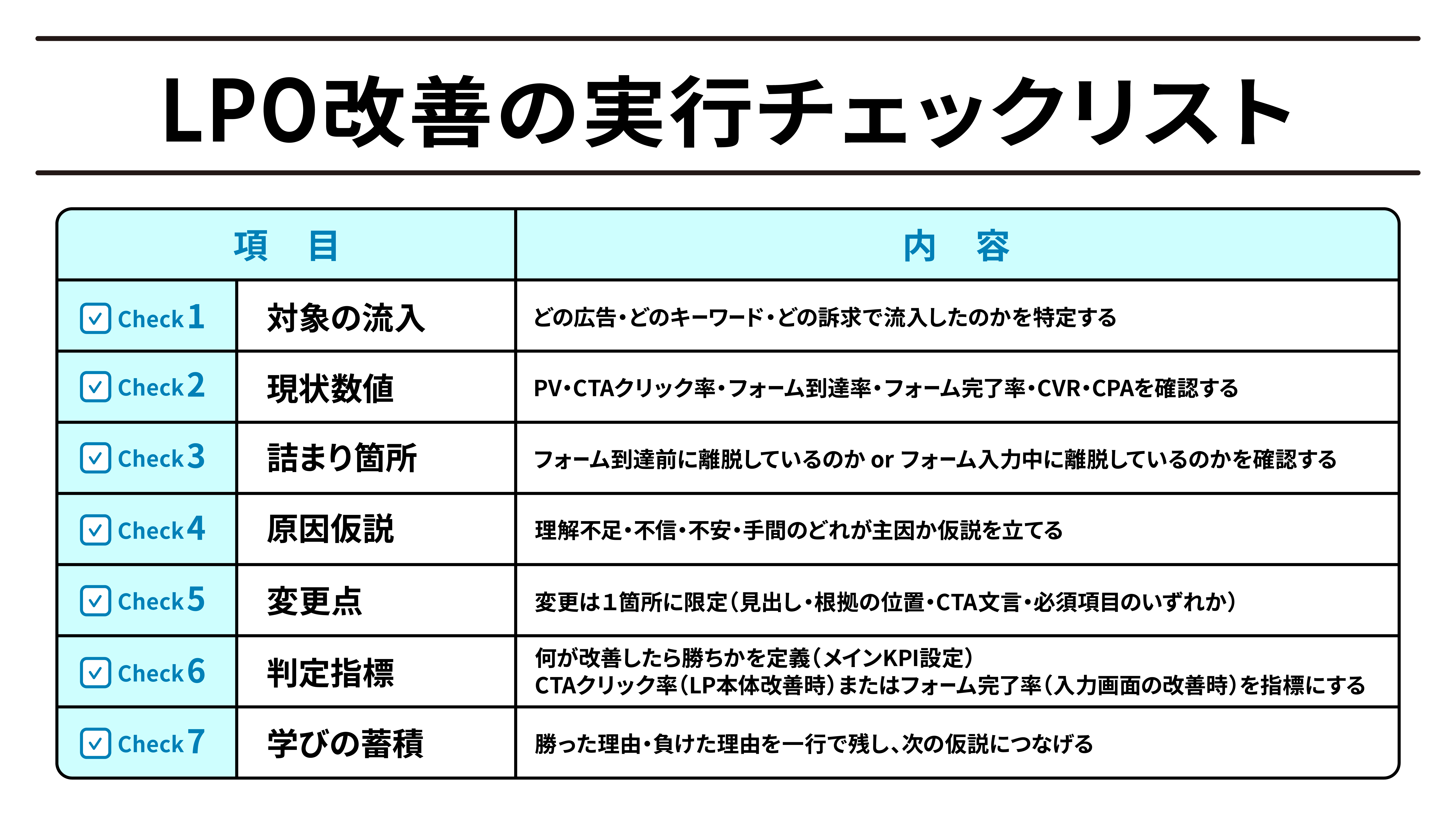 ✅目標・KPI確認 → 導線可視化 → LP分析 → 仮説 → 実行 → 検証(PDCA)