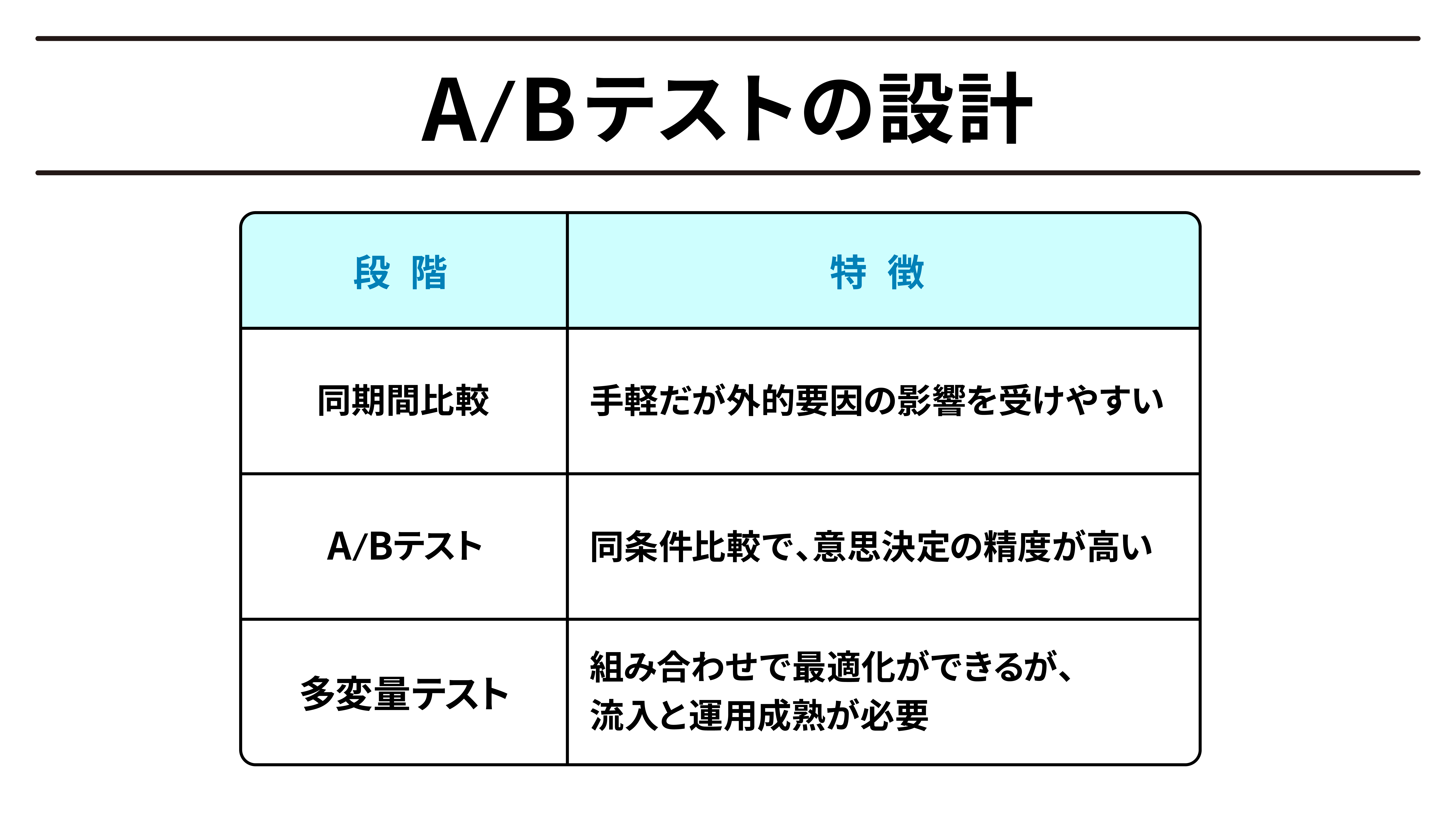A. 必須ではありません。最初は同期間比較(改善前後を近い条件で比較)でも方向性の確認はできます。ただし外的要因(季節、競合、配信のブレ)で数字が動くため、確実に「どちらが良いか」を判断したい局面ではA/Bテスト(同条件比較)が有効です。