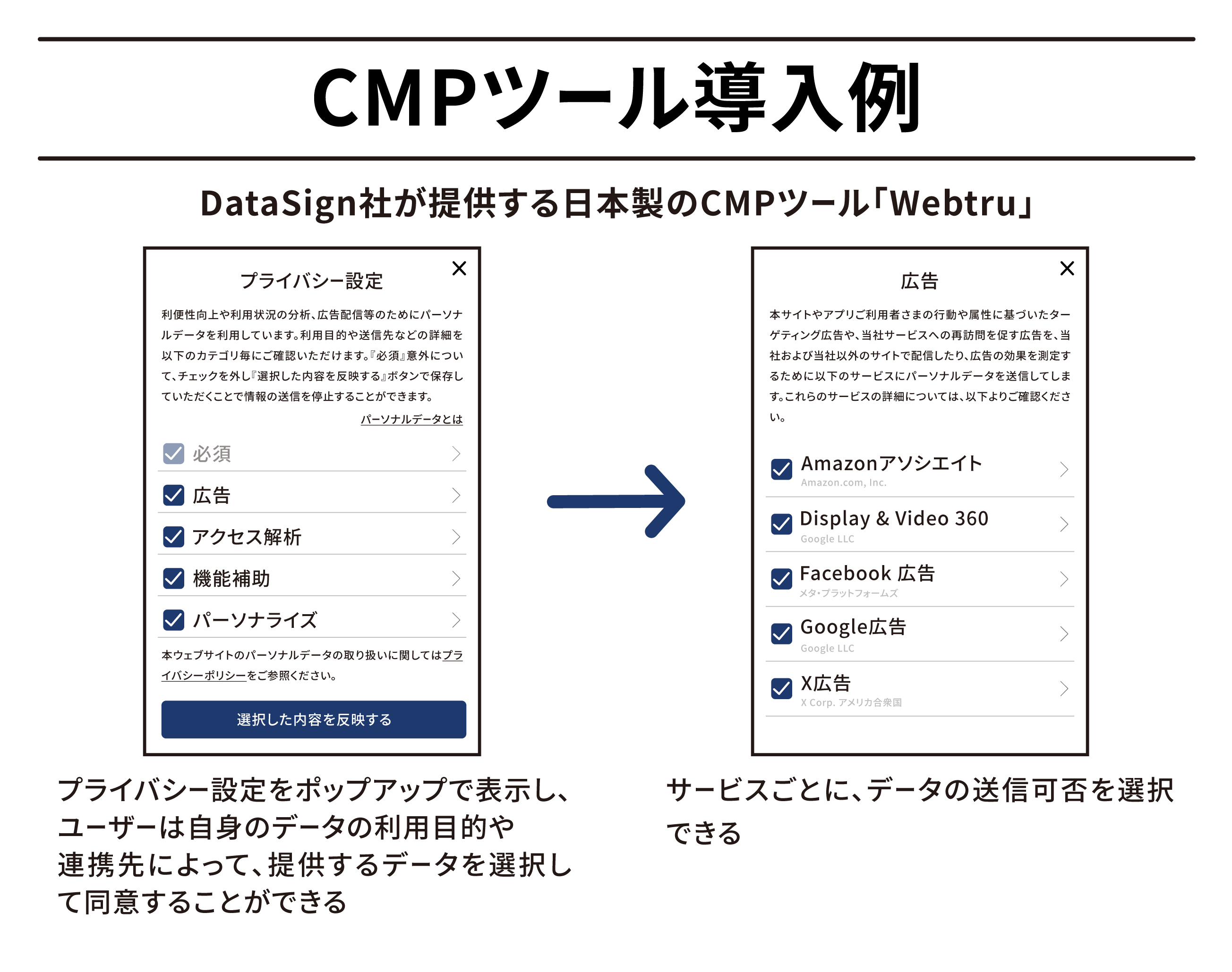 CMPは本来、同意の取得に加えて、同意の記録管理や、同意に合わせた計測・広告の動作制御まで含みます。
