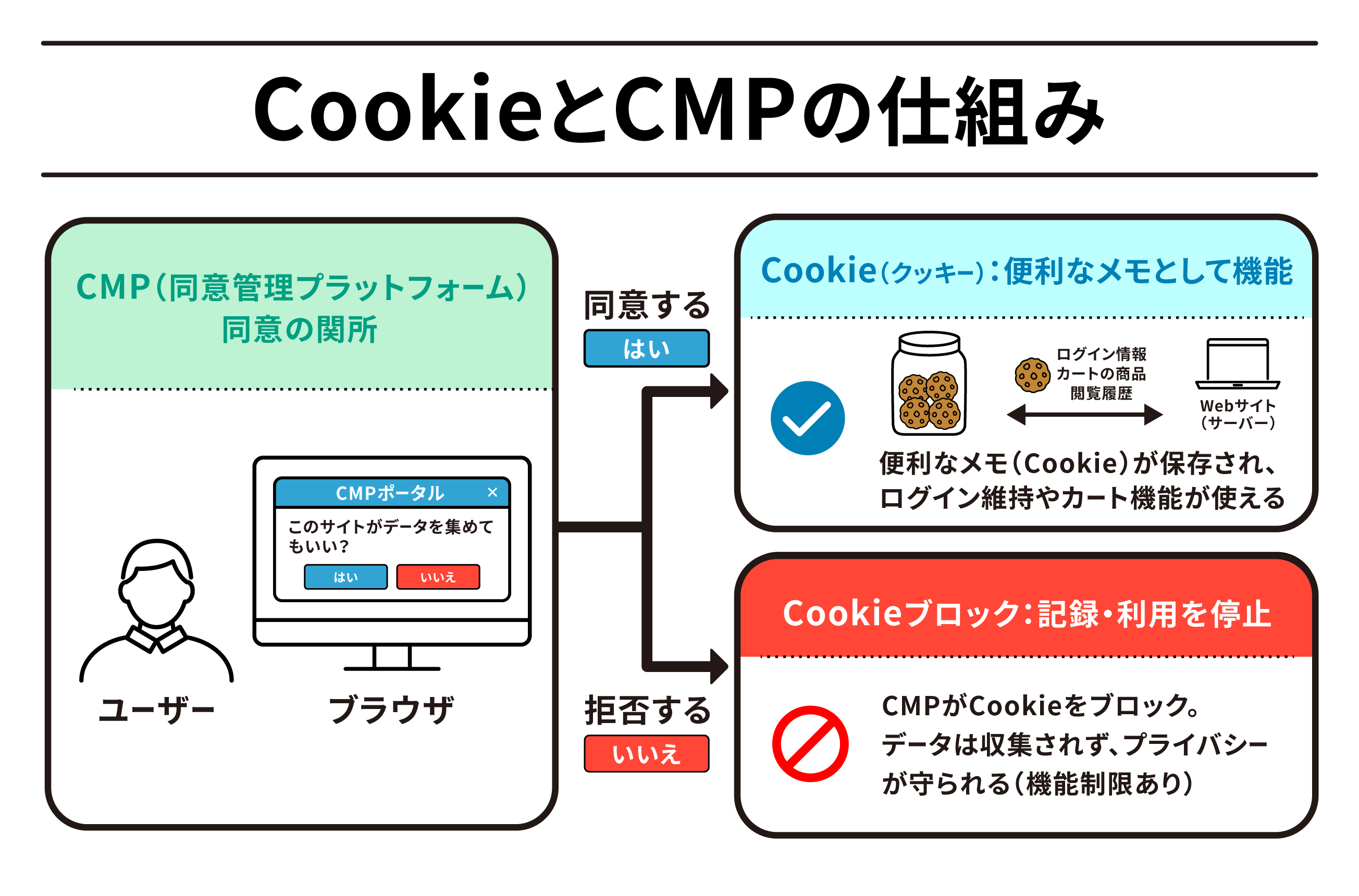 そしてCMPは、そのCookieやデータ利用について「同意を取って、記録して、同意に合わせて止める」ための仕組みなのよ。