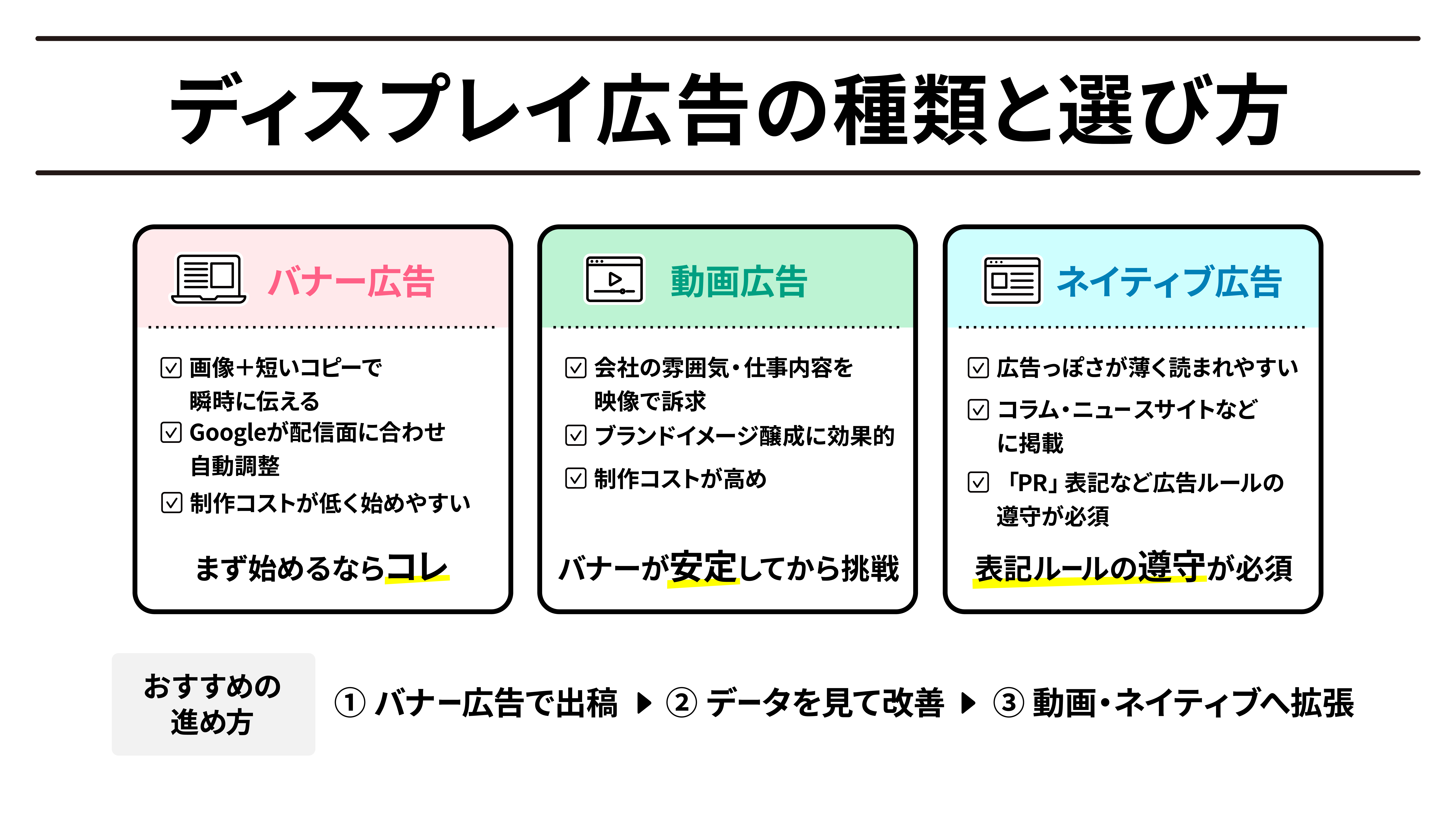 ⚫︎広告の種類は、バナー広告・動画広告・ネイティブ広告が代表的。最初は始めやすいバナー広告から試すのが現実的。