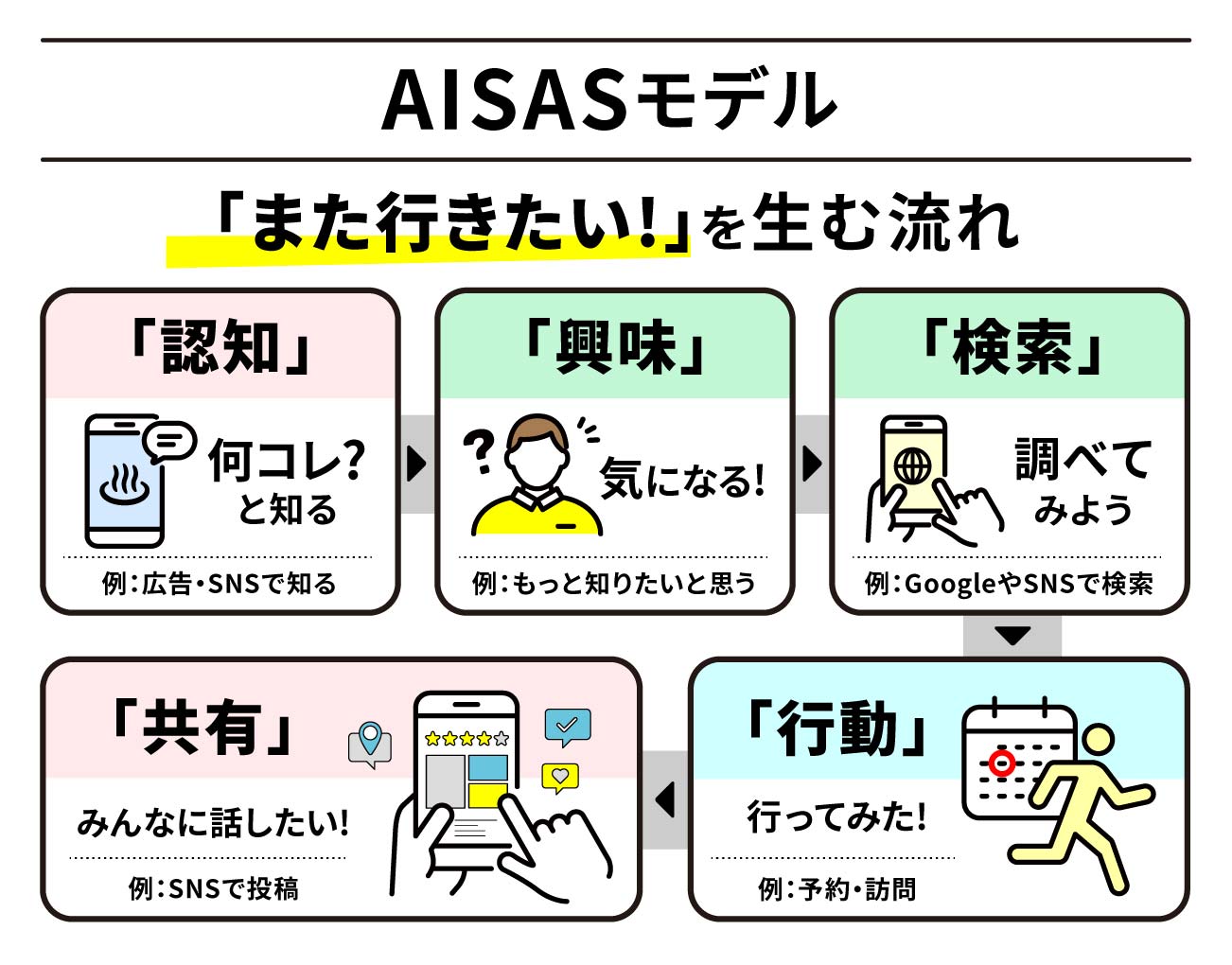 認知(Attention) → 興味(Interest) → 検索(Search) → 行動(Action) → 共有(Share)。