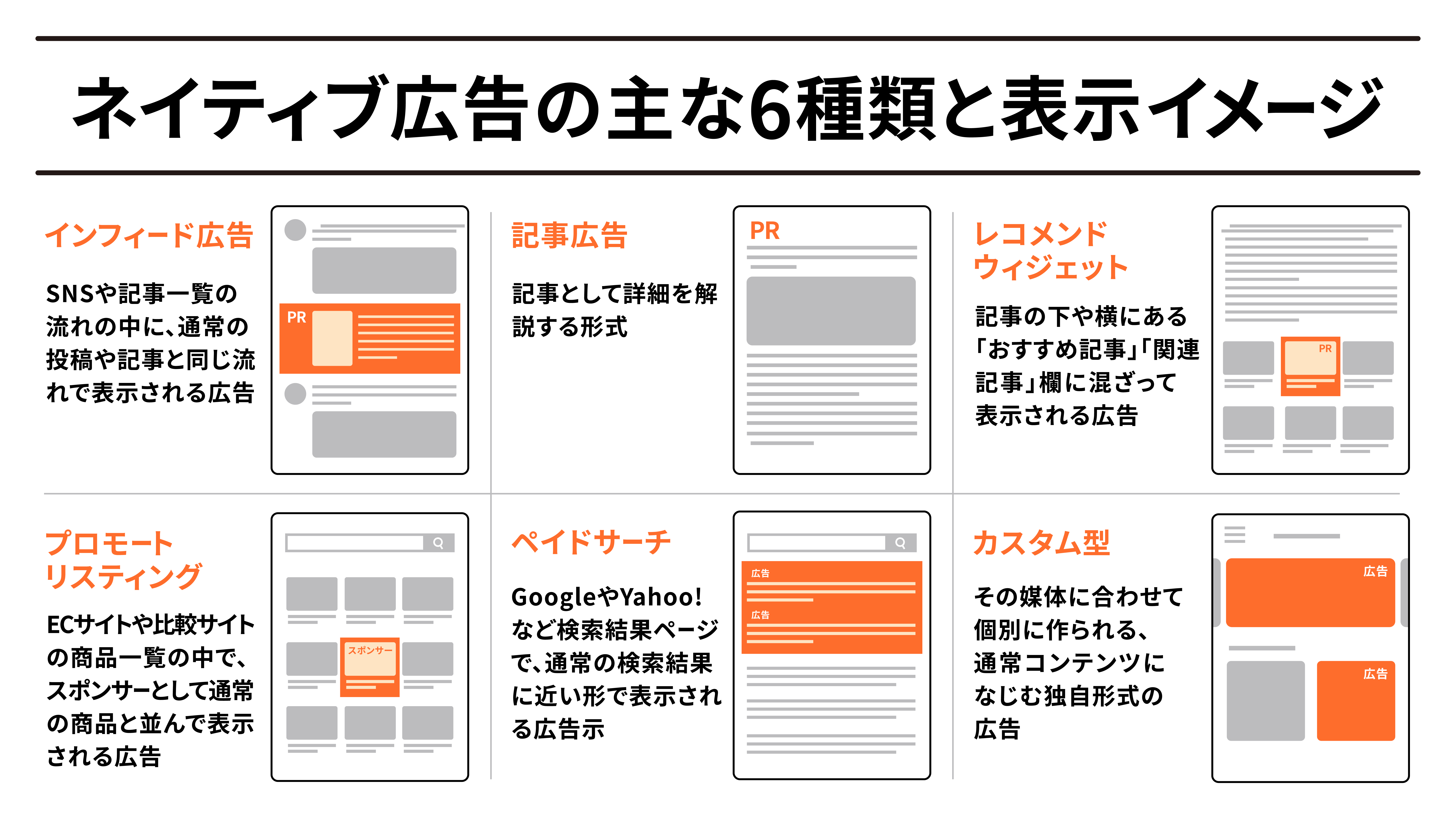 A3. 代表的な種類は、インフィード、記事広告、レコメンドウィジェット、プロモートリスティング、ペイドサーチ、カスタムです。