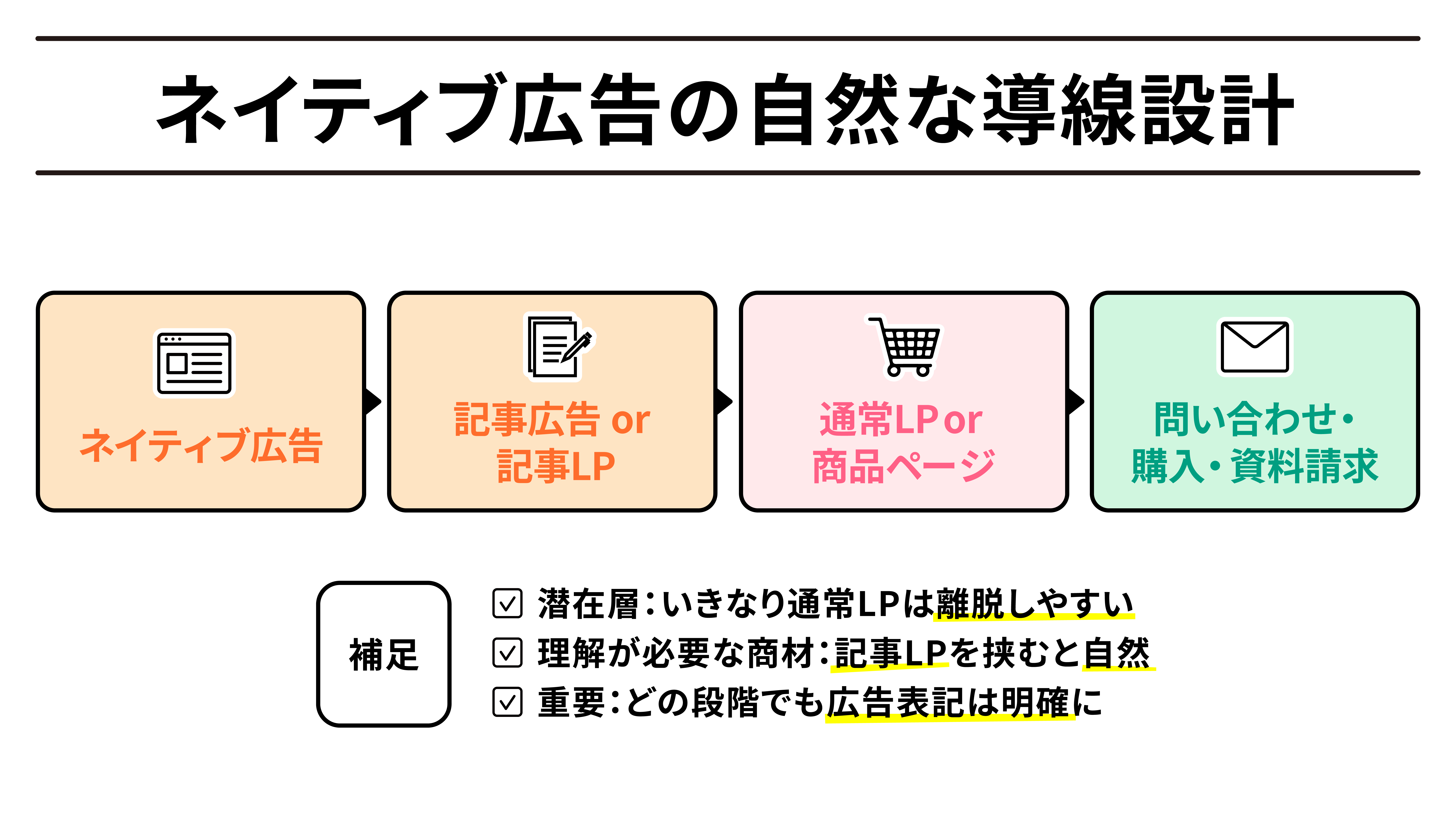 ネイティブ広告は、ただおすすめだから使う手法じゃなくて、内容・関連性・表示・仕組み・効果測定まで全部つながっている手法なのね」