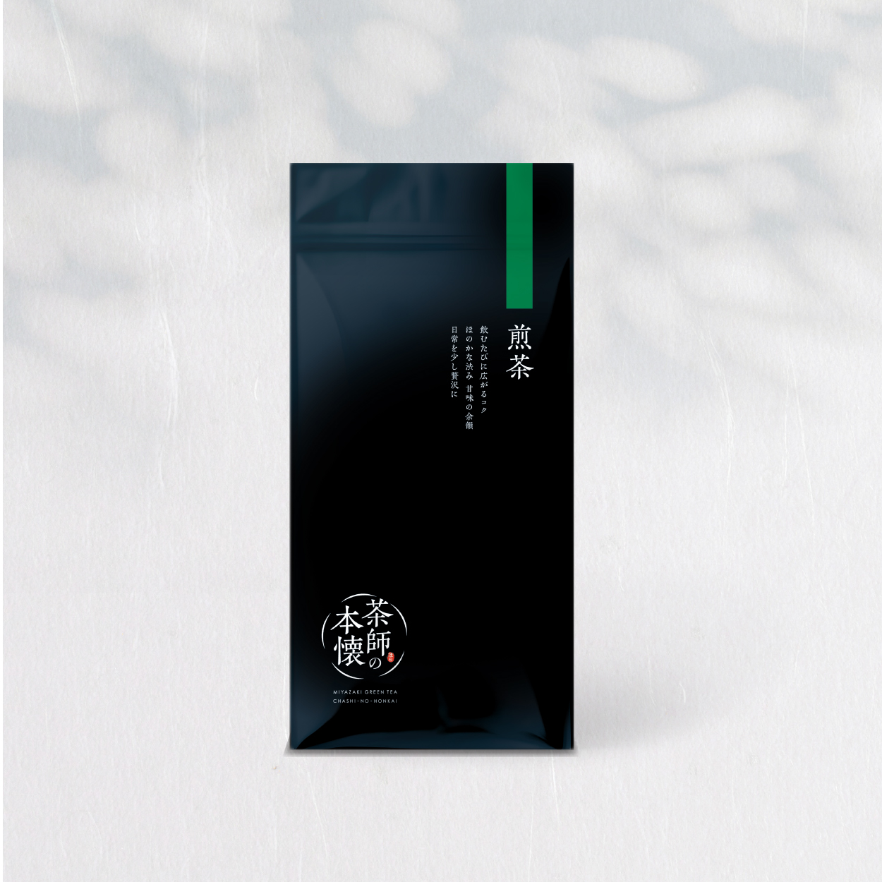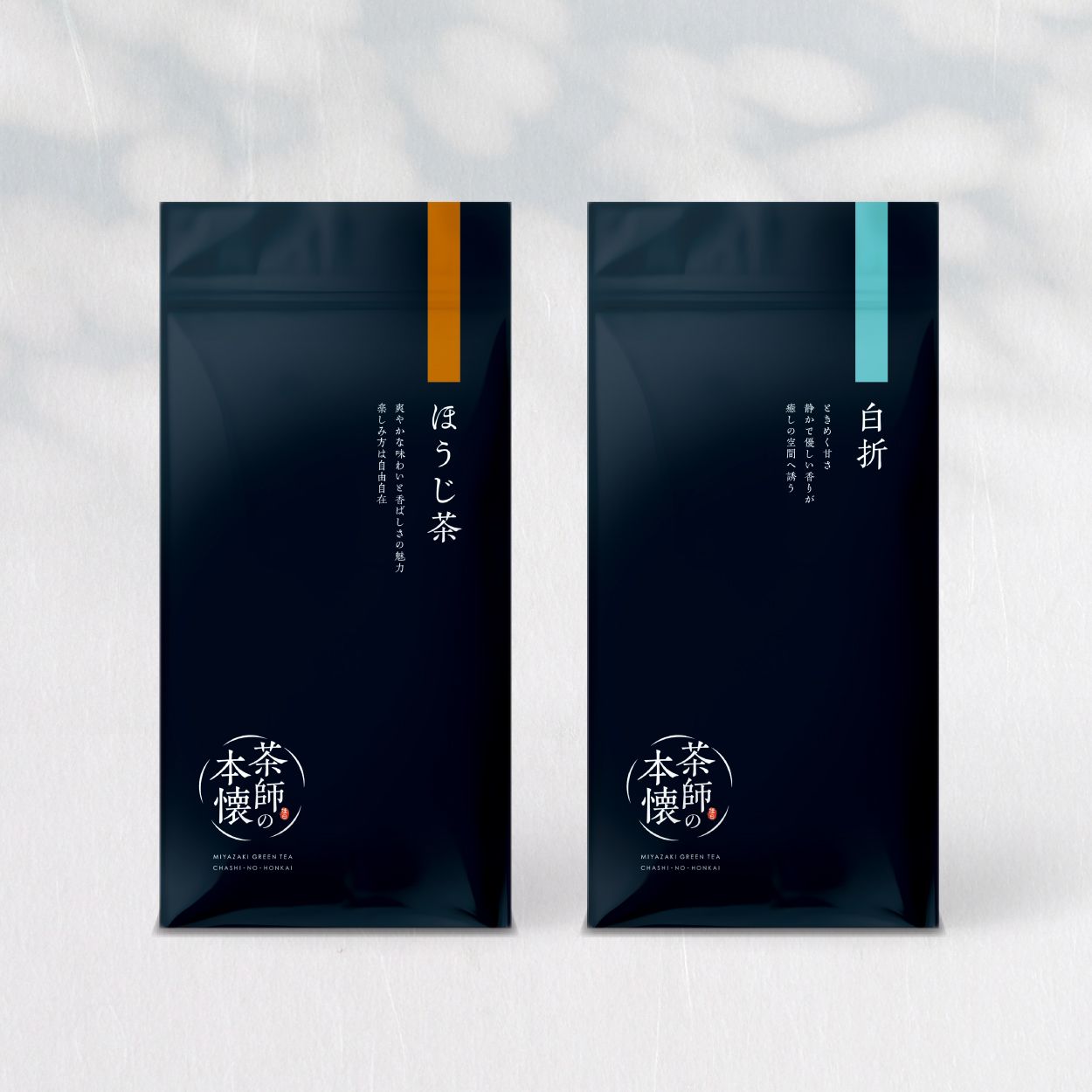パッケージは深い檳榔子黒を基調に、茶種ごとの個性を一筋の色で判別できるようにデザイン。煎茶は旨味と余韻を示す常磐色、白折は清涼感のある水浅葱、ほうじ茶は焙煎の甘みを想起させる黄櫨染で、暮らしにそっと馴染むお茶を目指しました。